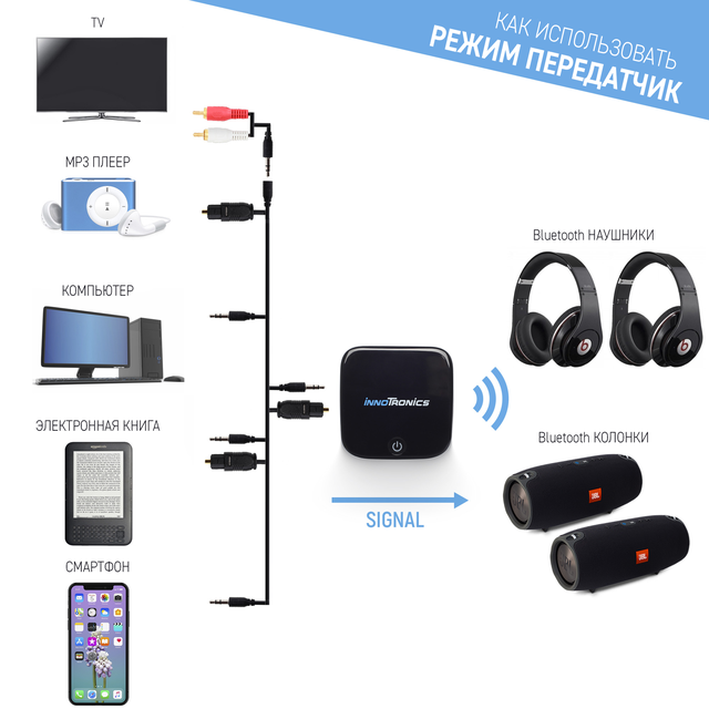 Б) Як Bluetooth передавач як трансмітер адаптер innoTronics перетворює будь-який телевізор, комп'ютер або будь-який інший звуковий пристрій на центр бездротового передавання звуку. Він бере аудіопотік через цифровий оптичний або AUX кабель і спрямовує його через Bluetooth безпосередньо на ваші Bluetooth-навушники, колонки або будь-які сумісні Bluetooth аудіопристрою, забезпечуючи комфорт і свободу прослуховування без дротів.